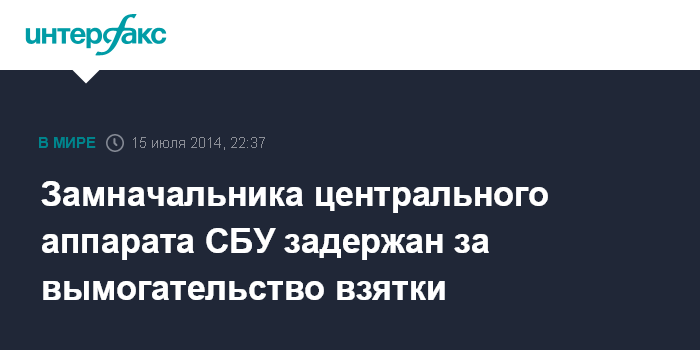 Москва. 15 июля. INTERFAX.RU - Заместитель начальника центрального аппарата Службы безопасности Украины задержан при получении взятки. Об этом сообщает управление по связям с общественностью и СМИ Генеральной прокуратуры Украины.