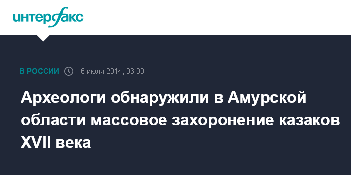 Москва. 16 июля. INTERFAX.RU - Археологи нашли в Амурской области массовое захоронение казаков, которое относится к XVII веку. Об этом "Интерфаксу" сообщил пресс-секретарь "Албазинской экспедиции" Роман Сорокин.