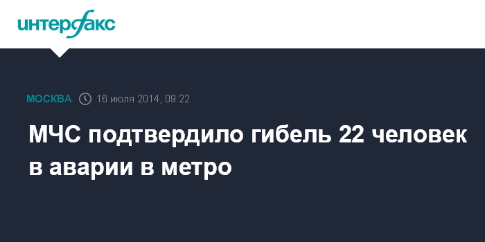 Москва. 16 июля. INTERFAX.RU - В МЧС России подтвердили, что в результате аварии в московском метро погибли 22 человека.