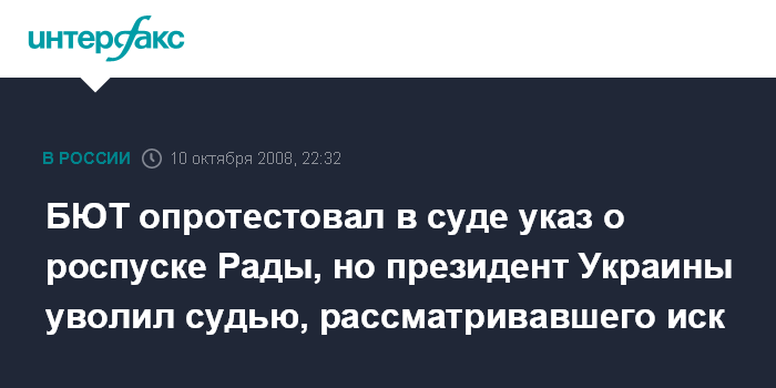 "Он (судья - ИФ) не имел полномочий рассматривать иск избирательного Блока Юлии Тимошенко относительно остановки действия указа президента N 911/2008 "О досрочном прекращении полномочий Верховной Рады Украины 6-го созыва и назначении внеочередных выборов", - заявил руководитель Службы представительства в судах Украины интересов президента Украины и созданных ним консультативных, совещательных и других вспомогательных органов и служб секретариата президента Украины Руслан Кирилюк.