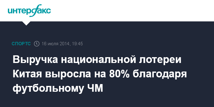 Москва. 16 июля. INTERFAX.RU - Продажи билетов национальной лотереи Китая подскочили в июне на 83% в годовом выражении на фоне чемпионата мира по футболу, проходившего в Бразилии, сообщает Financial Times.