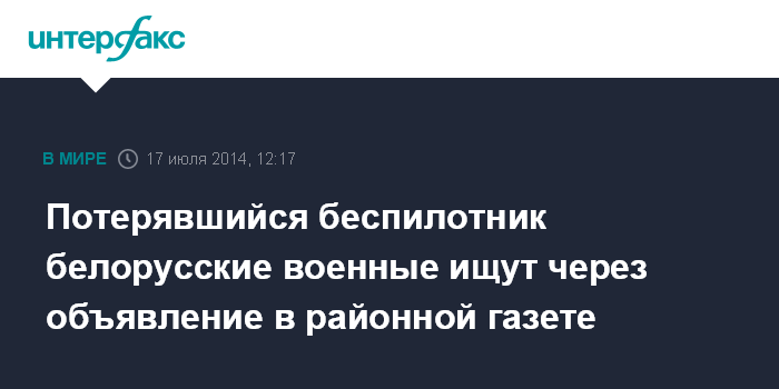 Центр подготовки и применения беспилотных авиационных комплексов ВВС и войск ПВО Беларуси разместил объявление в районной массово-политической газете "Маяк" Березовского района Брестской области о том, что "10 июля в 17:00 при проведении полетов утерян самолет-беспилотник воинской части города Березы". В объявлении размещена фотография беспилотника и приведен номер контактного телефона.
