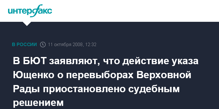 Как сообщил агентству "Интерфакс-Украина" представлявший интересы БЮТ в суде депутат Владимир Пилипенко, решение суда приято по административному иску БЮТ к президенту и Центральной избирательной комиссии до рассмотрения иска по существу. Кроме того, решением суд президенту запрещено осуществлять какие-либо действия, направленные на подготовку и проведение внеочередных выборов, назначенных на 7 декабря.