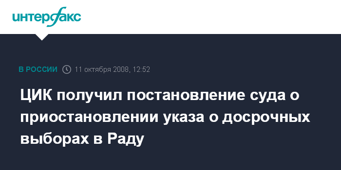 Москва. 11 октября. INTERFAX.RU - В Центральную избирательную комиссию поступило постановление Окружного административного суда Киева, которым приостанавливается действие указа президента Украины Виктора Ющенко ь911/2008 "О досрочном прекращении полномочий Верховной Рады Украины VI созыва и назначении внеочередных выборов".
