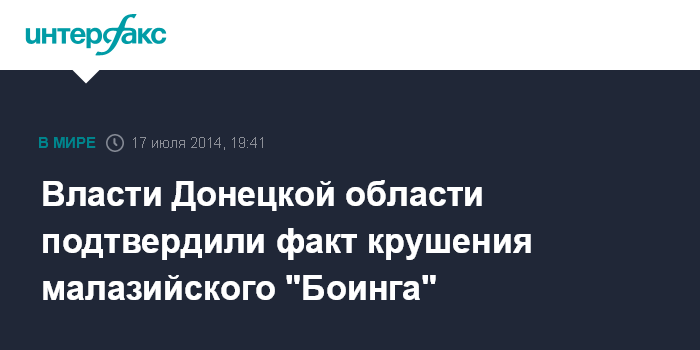 Москва. 17 июля. INTERFAX.RU - Факт падения малазийского авиалайнера, следовавшего из Амстердама в Куала-Лумпур, подтверждают в Донецкой облгосадминистрации.