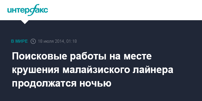 Москва. 18 июля. INTERFAX.RU - Поисковые работы на месте падения лайнера "Боинг-777" Малазийских авиалиний будут продолжаться и в ночное время, сообщили "Интерфаксу" в главном управлении Государственной службы по чрезвычайным ситуациям в Донецкой области.