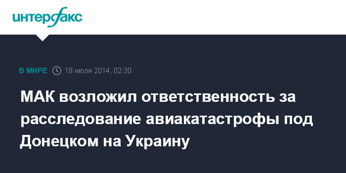 Москва. 18 июля. INTERFAX.RU - Председатель технической комиссии МАК Алексей Морозов заявил, что ответственность за расследование причин авиакатастрофы с малазийским "Боингом" лежит на Украине.