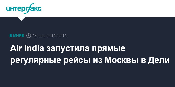 Москва. 18 июля. INTERFAX.RU – Air India с 18 июля запускает прямые еженедельные рейсы из московского аэропорта "Домодедово" в Дели, говорится в сообщении авиакомпании.