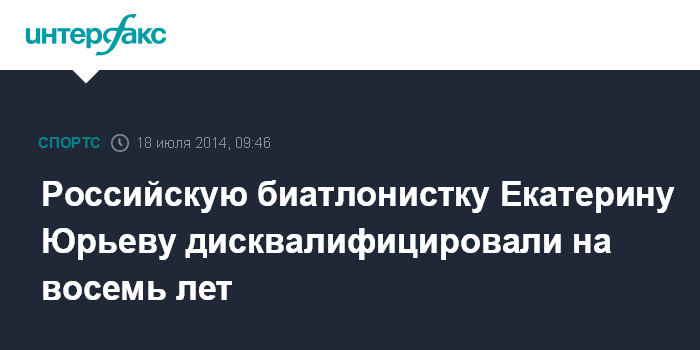 Москва. 18 июля. INTERFAX.RU - Международный союз биатлонистов (IBU) принял решение дисквалифицировать россиянку Екатерину Юрьеву на восемь лет за употребление запрещенных препаратов, сообщает официальный сайт организации.
