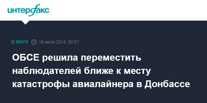 Москва. 18 июля. INTERFAX.RU - Специальная мониторинговая миссия (СММ) ОБСЕ на Украине переводит сотрудников к месту катастрофы Малайзийского авиалайнера, сбитого в четверг на востоке Донецкой области.