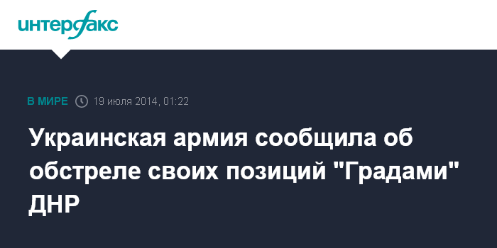 Москва. 19 июля. INTERFAX.RU - Вооруженные формирования самопровозглашенной Донецкой народной республики в пятницу обстреляли позиции украинских военных в Донецкой и Луганской областях, используя РСЗО "Град". Об этом сообщает пресс-центр силовой операции.