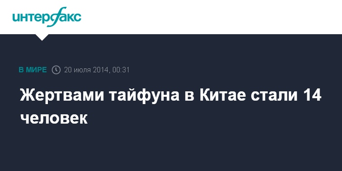 Москва. 20 июля. INTERFAX.RU - Жертвами тайфуна "Раммасун" в Китае стали 14 человек, сообщает агентство "Синьхуа".
