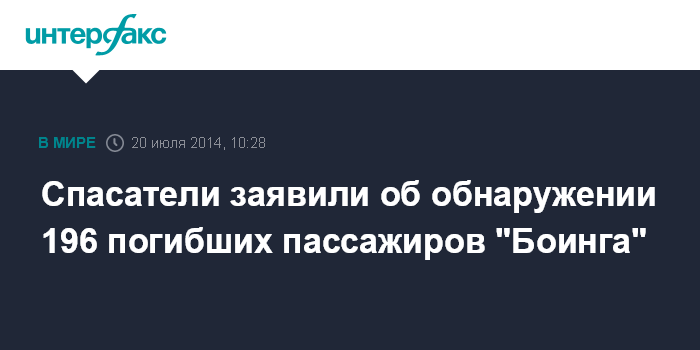 Москва. 20 июля. INTERFAX.RU - По состоянию на утро воскресенья, на месте падения малазийского лайнера "Боинг 777" на юго-востоке Украины обнаружены тела 196 погибших, сообщила пресс-служба Госслужбы по ЧС Украины.