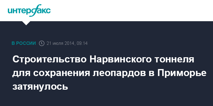 Москва. 21 июля. INTERFAX.RU - Власти Приморского края заявили, что сроки строительства автомобильного тоннеля, который создается для сохранения редких дальневосточных леопардов, затягиваются по вине генподрядчика.