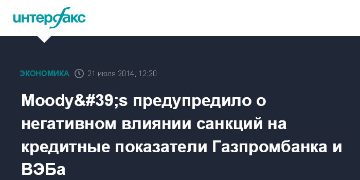 Москва. 21 июля. INTERFAX.RU - Санкции США в отношении Газпромбанка (ГПБ) и Внешэкономбанка (ВЭБа) окажут негативное влияние на кредитные показатели обоих финансовых институтов, поскольку ограничат их доступ к финансовым рынкам США и создадут сложности на европейских рынках, говорится в обзоре рейтингового агентства Moody's Investors Service.