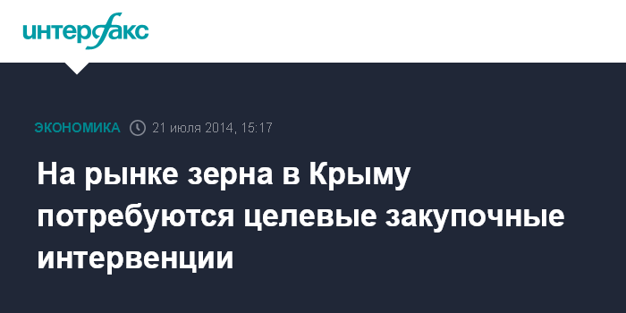 Москва. 21 июля. INTERFAX.RU - Цены на зерно начали снижаться, поэтому могут потребоваться целевые закупочные интервенции, особенно это касается Крыма, сообщил вице-премьер Аркадий Дворкович.