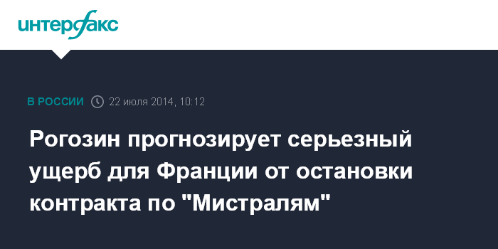 Москва. 22 июля. INTERFAX.RU - Приостановка контракта по "Мистралям" нанесет России гораздо меньший ущерб, чем Франции, если французская сторона откажется от выполнения обязательств по поставкам двух вертолетоносцев для ВМФ РФ, считает вице-премьер Дмитрий Рогозин.