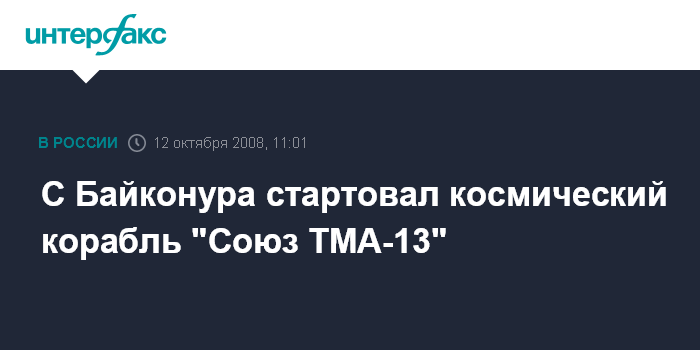 Байконур. 12 октября. INTERFAX.RU - Российская ракета-носитель "Союз-ФГ" с космическим кораблем "Союз ТМА-13" в воскресенье стартовала с Байконура (Казахстан), передает корреспондент "Интерфакса-АВН" с космодрома.