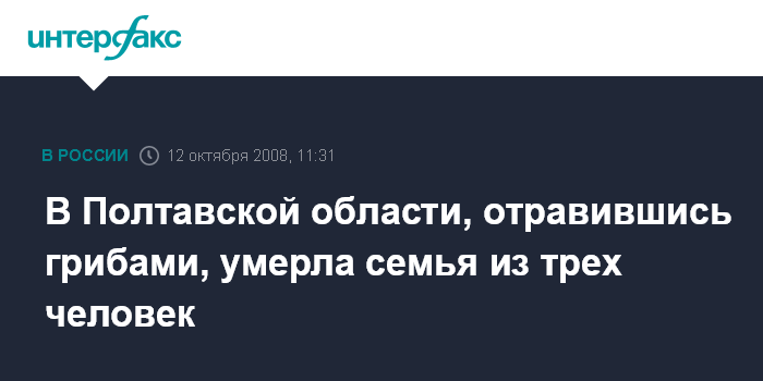 Киев. 12 октября. INTERFAX.RU - В селе Пятихатки Полтавской области, вероятно, от отравления грибами умерла семья из трех человек, сообщает в воскресенье пресс-служба Министерства по вопросам чрезвычайных ситуаций Украины.
