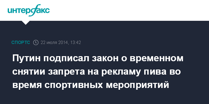 Москва. 22 июля. INTERFAX.RU - Президент России Владимир Путин подписал закон, отменяющий до 2019 года запрет на рекламу пива во время официальных спортивных мероприятий, сообщается на официальном интернет-портале правовой информации.