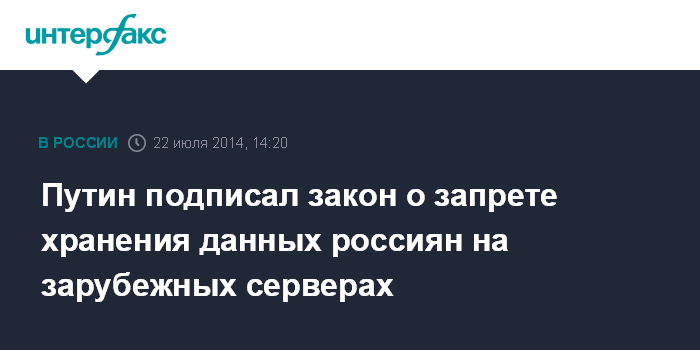 Москва. 22 июля. INTERFAX.RU - Президент Владимир Путин во вторник подписал закон, обязывающий хранить на территории России персональные данные россиян, обрабатываемые через интернет.