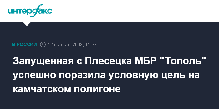 Плесецк (Архангельская область). 12 октября. INTERFAX.RU - Межконтинентальная баллистическая ракета РС-12М "Тополь", пуск которой осуществлен в воскресенье с космодрома Плесецк, поразила условную цель на полигоне Кура (Камчатка).