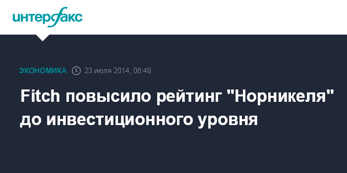 Москва. 23 июля. INTERFAX.RU - Международное рейтинговое агентство Fitch повысило долгосрочный рейтинг дефолта эмитента (РДЭ) ОАО "ГМК "Норильский никель" до "BBB-" с "BB+", сообщается в пресс-релизе агентства. Прогноз по рейтингу - "стабильный".