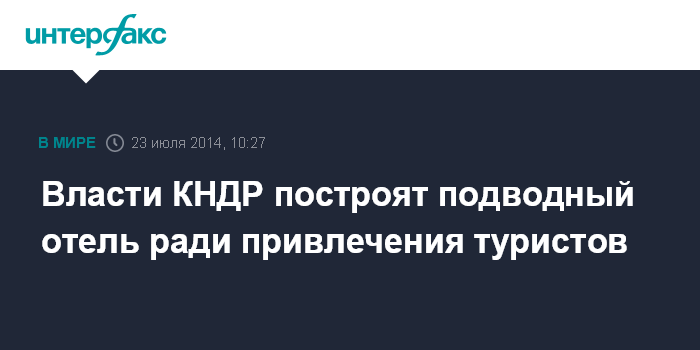 Москва. 23 июля. INTERFAX.RU - В северокорейском городе Вонсан в рамках развития туризма построят подводную гостиницу, пишет в среду британская газета Guardian. Подводный отель, цветочный парк, международный конференц-зал, выставочный павильон и стадион будут расположены на полуострове Кальма.