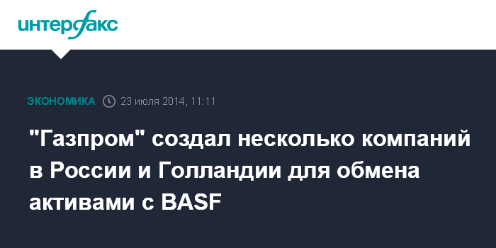 Москва. 23 июля. INTERFAX.RU - "Газпром" создал несколько новых компаний, названия которых говорят об их причастности к структурированию сделки по обмену активами с BASF/Wintershall.