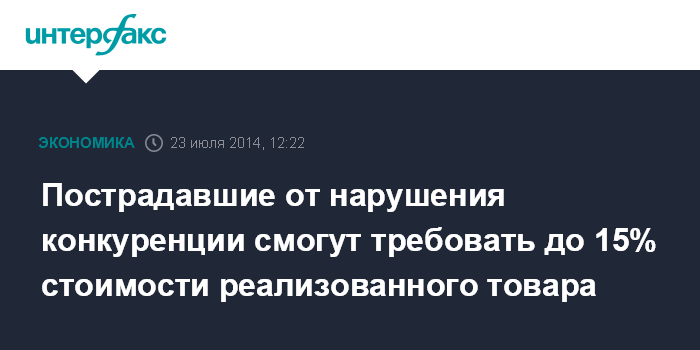 Москва. 23 июля. INTERFAX.RU - ФАС подготовила поправки в закон "О защите конкуренции", разрешающие пострадавшим от нарушения антимонопольного законодательства требовать от нарушителя от 1% до 15% от стоимости товара, реализованного с нарушением. Проект поправок опубликован на сайте ведомства.