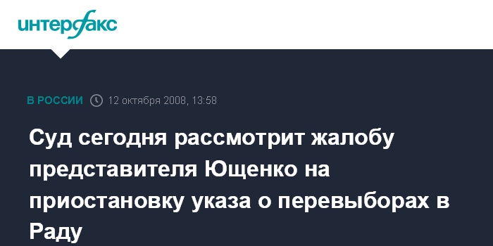 Киев. 12 октября. INTERFAX.RU - В воскресенье, 12 октября, в 14.00 по киевскому времени начнется заседание Киевского апелляционного административного суда. На нем будет рассмотрена апелляционная жалоба на определение Окружного административного суда Киева, которым было приостановлено действие указа президента Украины о досрочном прекращении полномочий парламента и назначении внеочередных выборов, сообщает пресс-служба главы государства.