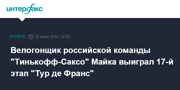 Велогонщик российской команды "Тинькофф-Саксо" Майка выиграл 17-й этап "Тур де Франс"