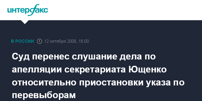 Киев. 12 октября. INTERFAX.RU - Киевский апелляционный административный суд перенес слушание дела по апелляции секретариата президента Украины на определение Окружного админсуда Киева о приостановлении действия указа о досрочном прекращении полномочий Верховной Рады Украины и внеочередных парламентских выборах на понедельник, 13 октября, на 16.00.