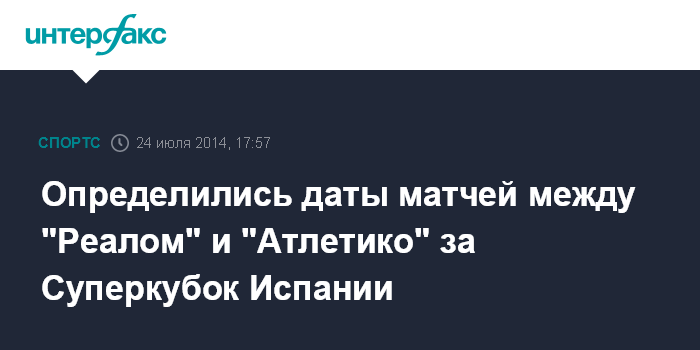 Москва. 24 июля. INTERFAX.RU - Стали известны даты матчей за Суперкубок Испании по футболу, в котором встретятся два мадридских клуба - чемпион страны "Атлетико" и победитель Кубка Испании "Реал".