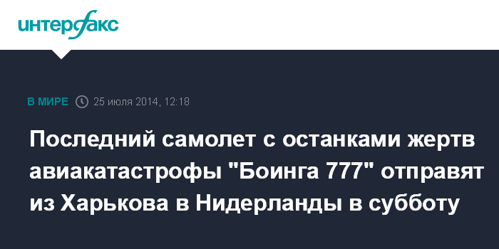 Москва. 25 июля. INTERFAX.RU - Последний самолет со спецконтейнерами с останками погибших в результате крушения малазийского "Боинга 777" вылетит из Харькова в Нидерланды 26 июля, сообщила пресс-секретарь полиции Нидерландов Эстер Набэр.