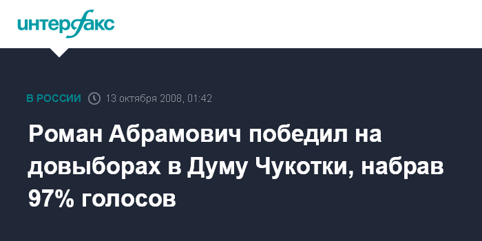 Анадырь. 13 октября. ИНТЕРФАКС-ДАЛЬНИЙ ВОСТОК - Бывший губернатор Чукотского автономного округа Роман Абрамович одержал убедительную победу в ходе состоявшихся в воскресенье довыборов депутатов окружной Думы.