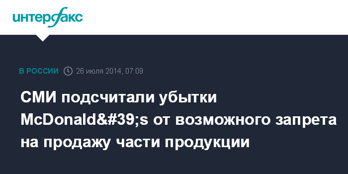 Москва. 26 июля. INTERFAX.RU - Потери сети ресторанов быстрого питания McDonald's в случае, если Роспотребнадзор запретит продажу бургеров, чизбургеров, филе-о-фиш, чикенбургеров, мороженого с наполнителем и коктелей эксперты оценивают в 40% всей выручки сети, или в 20 млрд рублей в год, сообщает газета "Известия".