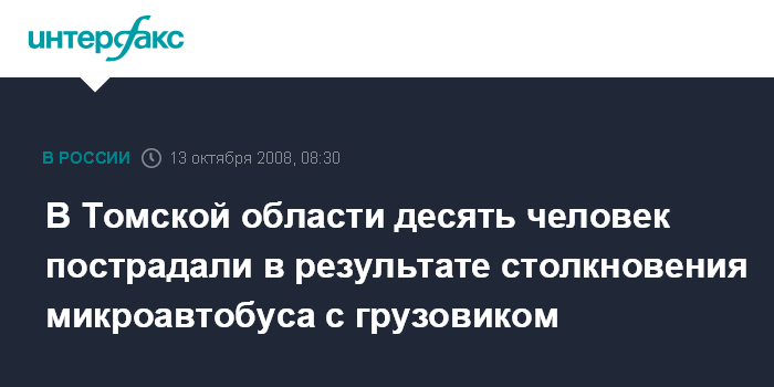 "На 62-м км трассы Томск - Мельниково, прямо на мосту, произошло лобовое столкновение грузового автомобиля "Тойота" и микроавтобуса "Хундай". Травмы различной степени тяжести получили 10 человек, все они госпитализированы в центральную районную больницу", - сообщил агентству "Интерфакс-Сибирь" сотрудник пресс-службы ГУ МЧС по Томской области.