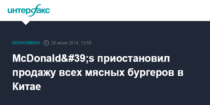 Москва. 28 июля. INTERFAX.RU - Сеть ресторанов быстрого питания McDonald's приостановила продажу в Китае всех продуктов в своем меню, в состав которых входит мясо, после скандала с поставками просроченной продукции, сообщает агентство Bloomberg.