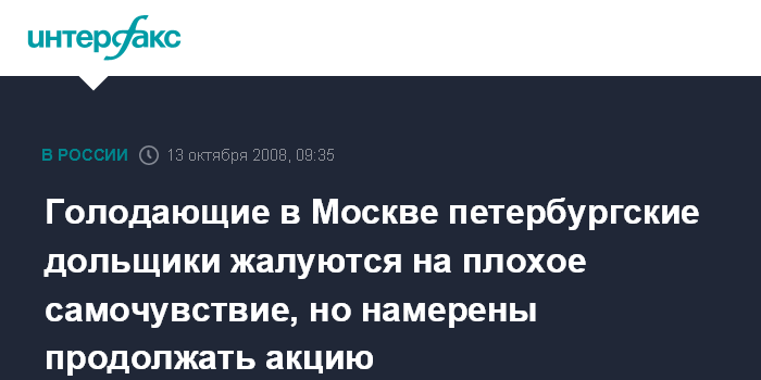 Москва. 13 октября. INTERFAX.RU - Hесколько петербургских обманутых дольщиков продолжают голодовку в одной из гостиниц Москвы.