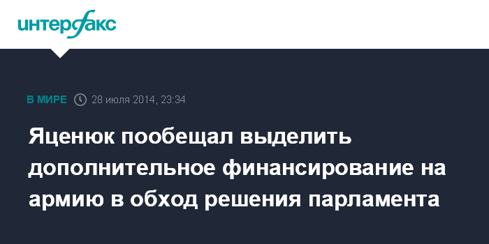 Москва. 28 июля. INTERFAX.RU - Премьер-министр Украины Арсений Яценюк выразил надежду на то, что парламент на внеочередном заседании в четверг примет изменения в госбюджет для увеличения финансирования армии, в противном случае он обещает выделить эти средства без соответствующего закона.