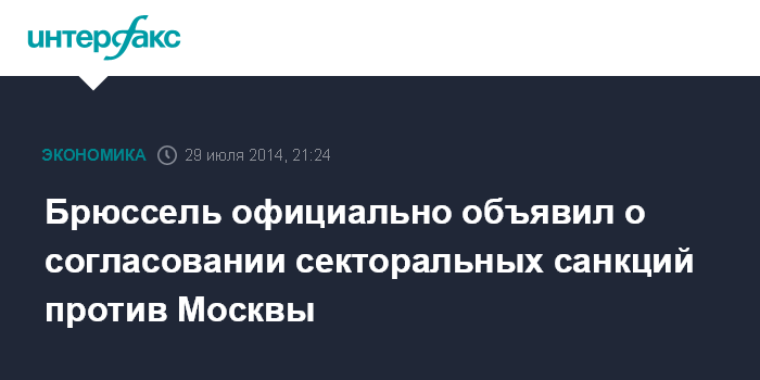 Москва. 29 июля. INTERFAX.RU - Страны-члены ЕС достигли договоренности по вопросу введения секторальных санкций в отношении России, заявили во вторник в Евросоюзе.