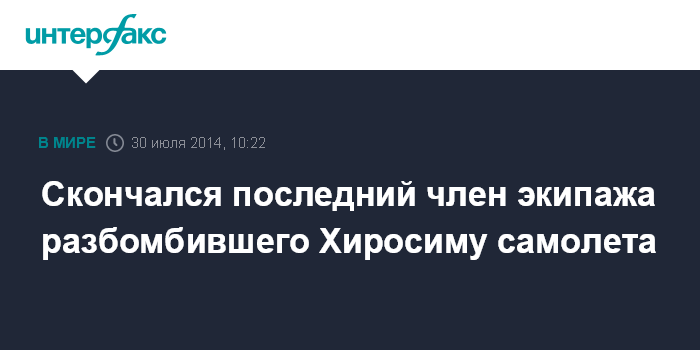 Москва. 30 июля. INTERFAX.RU - В американском штате Джорджия умер Теодор Ванкирк, последний остававшийся в живых член экипажа самолета "Энола Гэй", сбросившего ядерную бомбу на японский город Хиросима, сообщило агентство AP.