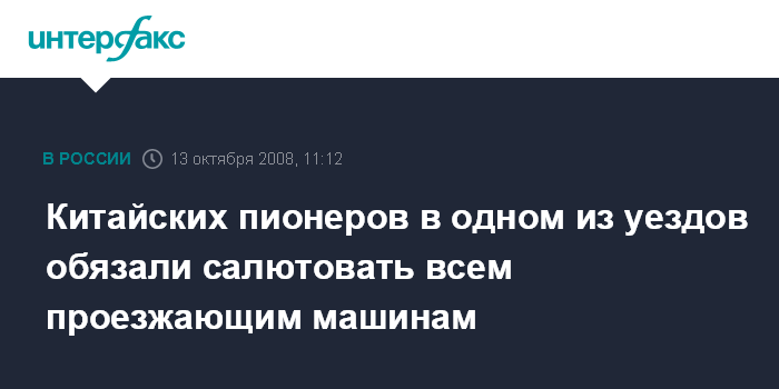 Москва. 13 октября. INTERFAX.RU - Все школьники-пионеры в уезде Хуанпин южной китайской провинции Гуйчжоу решением местных властей должны отдавать пионерский салют всем проезжающим автомашинам, сообщили местные СМИ.