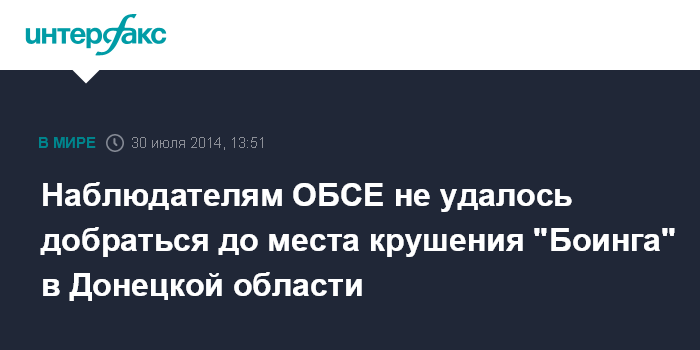 Москва. 30 июля. INTERFAX.RU - Международным наблюдателям в среду пришлось отказаться от очередной попытки добраться до места, где упал борт МН17 авиакомпании Malaysia Airlines на востоке Украины, сообщает агентство AP.