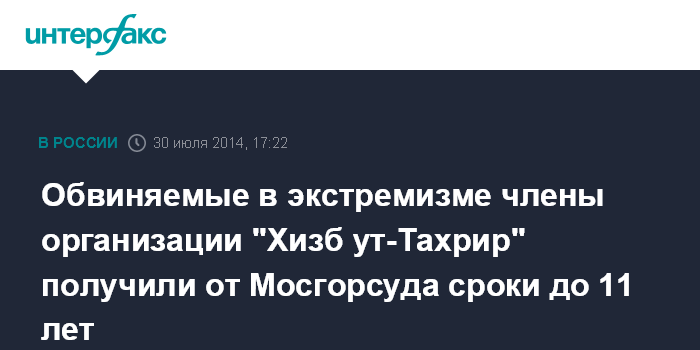Москва. 30 июля. INTERFAX.RU - Мосгорсуд приговорил к срокам от 7 до лет 11 лишения свободы членов организации радикалов-исламистов "Хизб ут-Тахрир аль-Ислами", признанных виновными в подготовке к захвату власти в России и других преступлениях экстремистского характера.