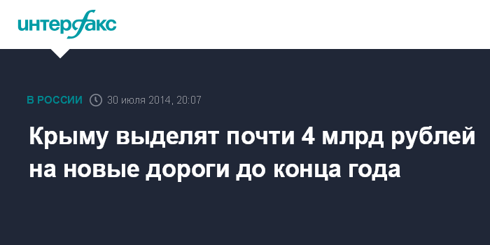 Москва. 30 июля. INTERFAX.RU - Почти 4 млрд рублей выделено Крыму до конца года на дорожное строительство, заявил в ходе "Прямой линии" в эфире ГТРК "Крым" и. о. главы Крыма Сергей Аксенов.