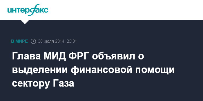 Москва. 30 июля. INTERFAX.RU - Германия готова поддержать жителей сектора Газа, выделив дополнительные €8,5 млн на гуманитарную помощь, заявил в среду глава МИД ФРГ Франк-Вальтер Штайнмайер.