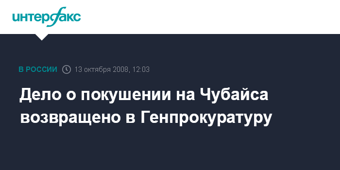 Москва. 13 октября. INTERFAX.RU - Мособлсуд вернул в Генпрокуратуру РФ дело о покушении на экс-главу РАО ЕЭС Анатолия Чубайса.
