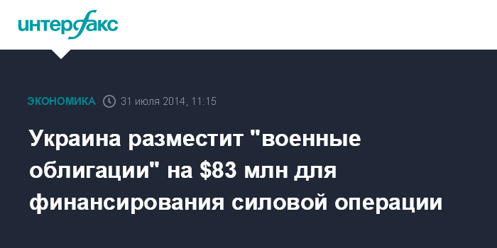 Москва. 31 июля. INTERFAX.RU – Министерство финансов Украины в четверг впервые предложит на аукционе облигации внутреннего государственного займа (ОВГЗ) "Военные облигации" общим номинальным объемом 1 млрд гривен ($83 млн).